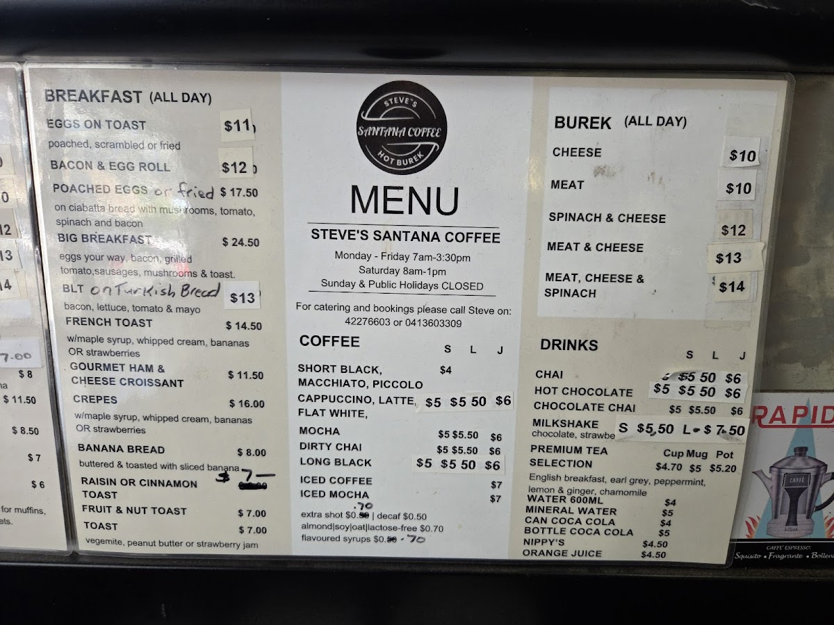 Customer feedback echoes the quality and service found at this cafe. As one happy patron, Tayla Durward, shares, "The service was so friendly and sweet... the coffee was amazing and having my first ever burek... I think I've found a new favorite snack." It's these personal experiences that make Steve's Santana Cafe not just a place to eat, but a place to feel welcomed, appreciated, and at home.